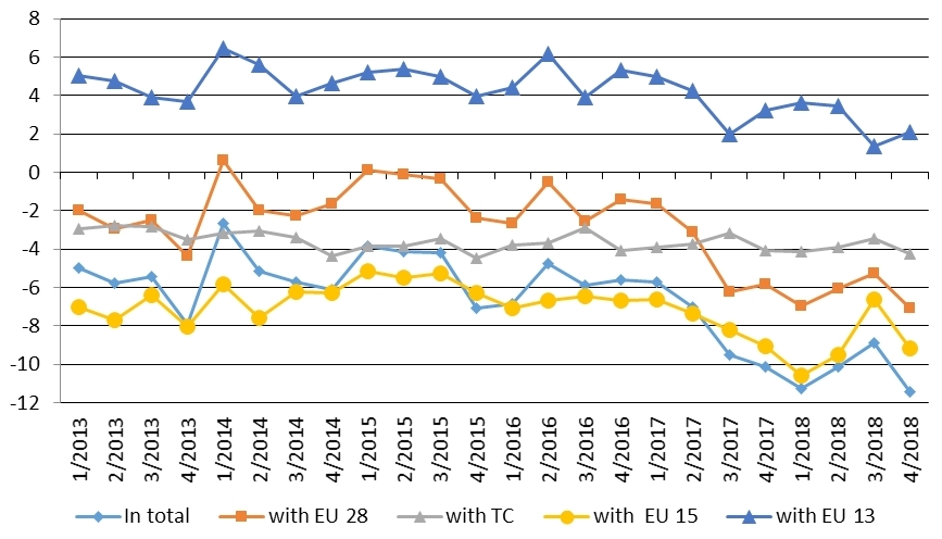 In 2018 the turnover from Czech international agrarian trade (IAT) decreased as well as in previous year. Exports achieved a year on year decrease of CZK 10 bn., i.e. 5 %, imports saw an increase of CZK 2.2 bn., i.e. 0.9 %. As a result of this development the annual deficit for Czech IAT deepened by 24 % to CZK 40.3 bn. The degree of import coverage by exports fell slightly by 3.6 p.p. to 82.2 %. As well as in the previous two years the negative trade balance with the EU 28 worsen also in 2018 when deepen by CZK 7.3 billion (43 %). In contrast, in the case of third countries, the trade deficit fell by 4.6 % to CZK 15.7 billion