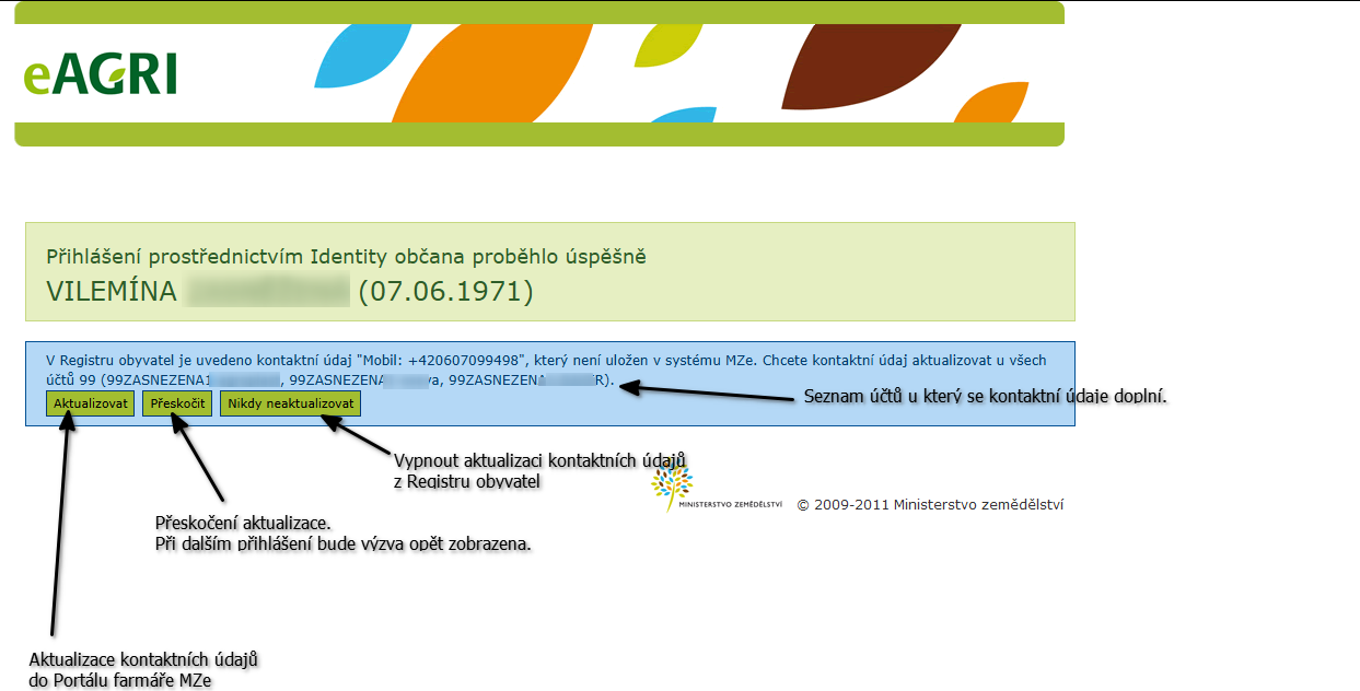 Po přihlášení osoby přes Identitu občana provede systém MZe stažení kontaktních údajů z Registru obyvatel. Pokud v Registru obyvatel jsou kontaktní údaje odlišné od kontaktních údajů v prostředí MZe tak je uživateli nabídnuta možnost uložit si kontaktní údaje z Registru obyvatel do prostředí MZe (tlačítko Aktualizovat). Pokud uživatel aktualizaci potvrdí, tak dojde k přidání kontaktních údajů do systému MZe. Tedy původní kontaktní údaje zůstanou a přidají se nové z Registru obyvatel.