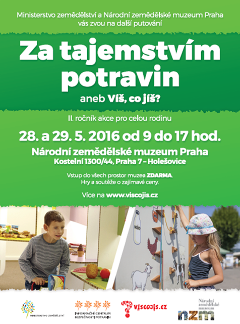 Úřad pro potraviny Ministerstva zemědělství ve spolupráci s Národním zemědělským muzeem Praha pořádají poslední květnový víkend, 28. a 29. května 2016, od 9 do 17 hodin v prostorách Národního zemědělského muzea 2. ročník zábavné soutěžní akce pro rodiny s dětmi: „Za tajemstvím potravin aneb Víš, co jíš?“.