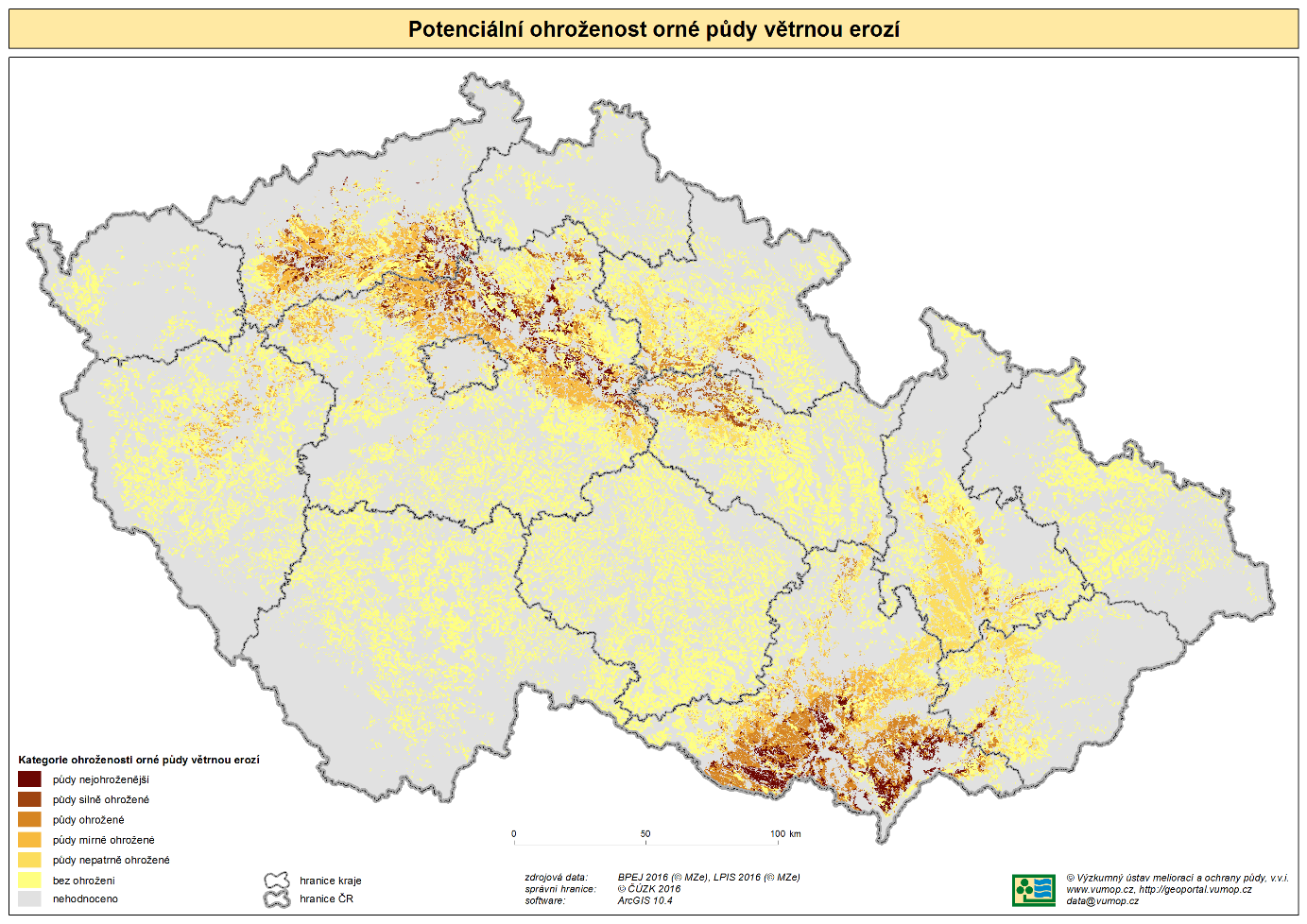 Stanovení potenciální ohroženosti zemědělské půdy větrnou erozí vychází z pedologické databáze bonitovaných půdně-ekologických jednotek. Byly využity údaje o klimatických regionech a údaje o hlavních půdních jednotkách, tedy faktory, které přímo ovlivňují větrnou erozi. Klimatický region je charakterizován sumou denních teplot nad 10 °C, průměrnou vláhovou jistotou za vegetační období, pravděpodobností výskytu suchých vegetačních období, průměrnými ročními teplotami a ročním úhrnem srážek. Hlavní půdní jednotka je určena zejména genetickým půdním typem, půdotvorným substrátem, zrnitostí, skeletovitostí a stupněm hydromorfismu.