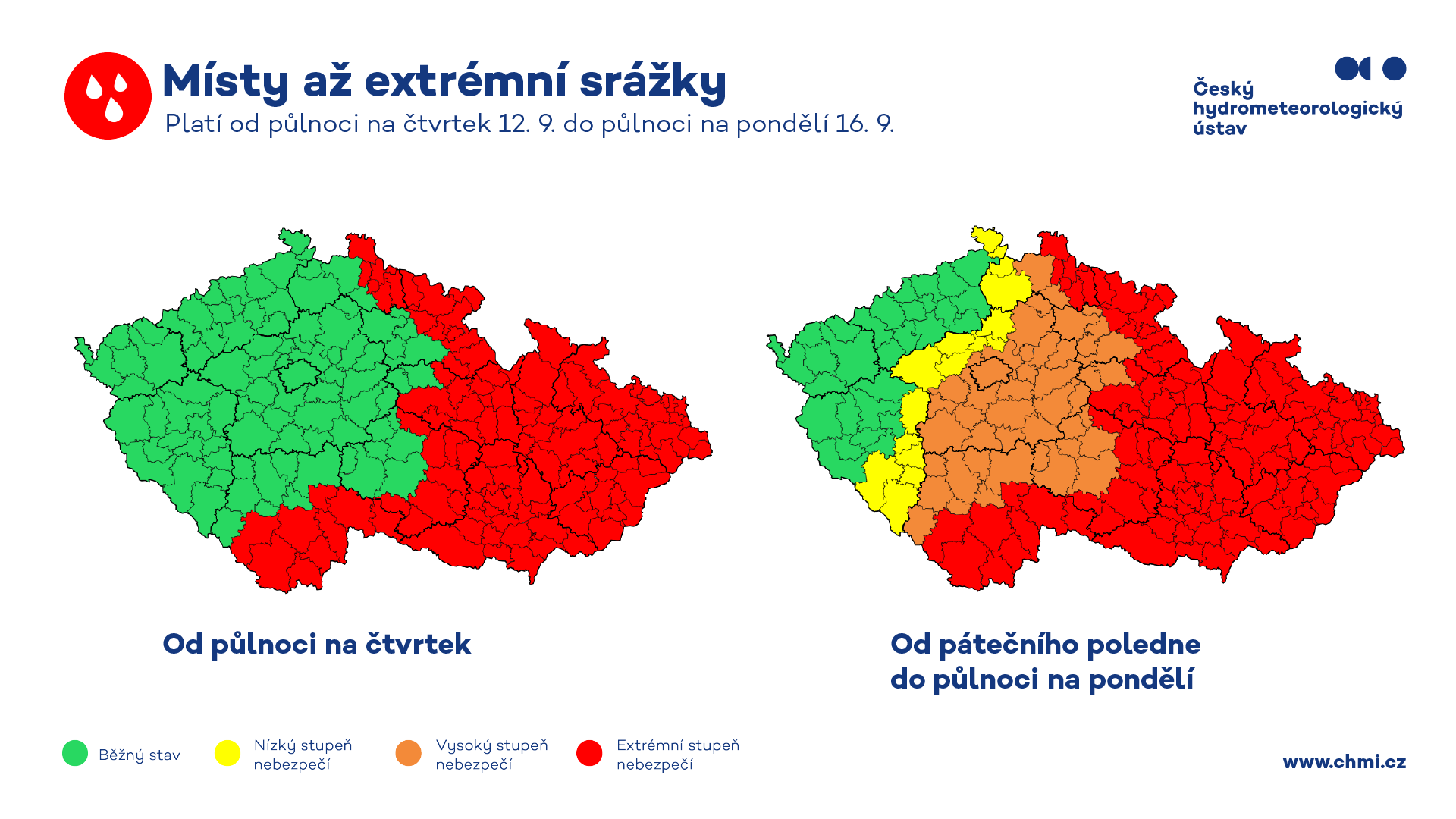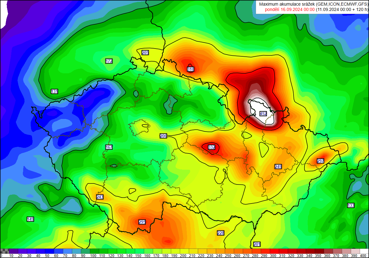 Tisková zpráva — Českou republiku zasáhnou od půlnoci na čtvrtek 12. září vydatné srážky, které se na našem území udrží až do konce týdne. Nejvíce by mělo pršet během soboty. Výstraha na extrémní srážky platí kromě Karlovarského a části Ústeckého kraje pro celé území České republiky. Nejvydatnější srážky předpokládají modely do nedělního večera v pásu od Novohradských hor přes Vysočinu až po Jeseníky. Zejména na severním a severozápadním návětří Jeseníků dávají modely extrémní srážkové úhrny přes 300 milimetrů za čtyři dny.