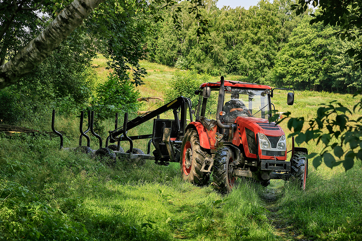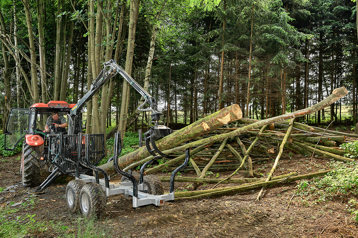 Klanicový vyvážecí vlek s hydraulickým jeřábem