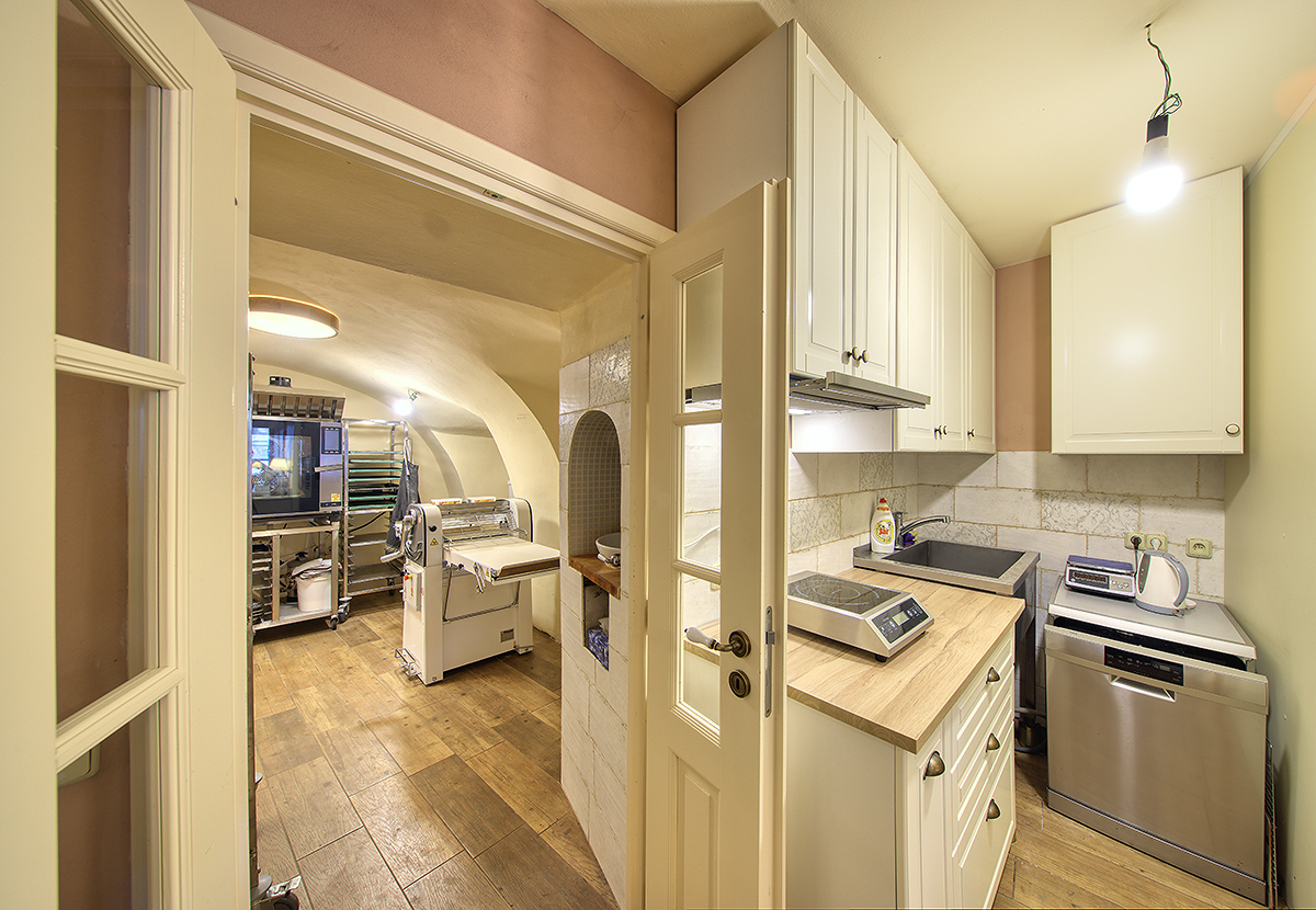 Dále pak kompletní zařízení prostor a vybavení provozovny (trouba, hnětač, rozvalovačka těsta, pracovní stoly, chladničky, vařič, nádobí a další vybavení).