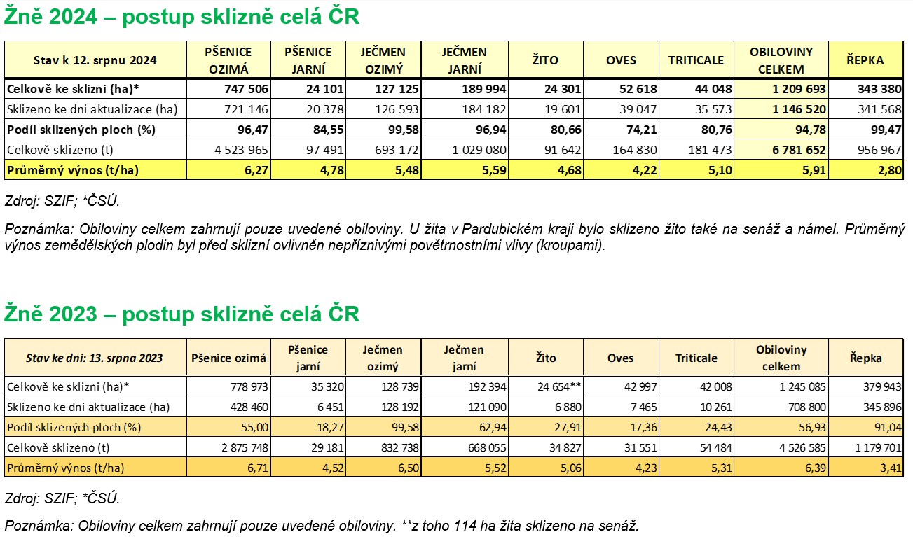 Příznivé počasí uplynulého týdne umožnilo zemědělcům i tentokrát rychlejší průběh sklizně. Ve 32. týdnu, podle 6. šetření Státního zemědělského intervenčního fondu (SZIF) k 11. 8. 2024, žňové práce u obilnin a řepky i nadále postupovaly, díky příznivému průběhu počasí, rychlejším tempem ve všech krajích. Aktuálně je sklizeno 94,78 % ploch obilnin, a zbývá tak sklidit něco přes 60 tis. ha. Téměř u konce je sklizeň řepky (99,47 % sklizených ploch), kde zbývá sklidit zhruba 1,8 tis. ha. V porovnání s průběhem postupu loňské sklizně, kdy je letošní o poznání rychlejší, byla touto dobou loňská sklizeň základních obilnin teprve za polovinou, přesněji bylo sklizeno 56,93 % ploch, sklizeno ale bylo 91,04 % ploch řepky.