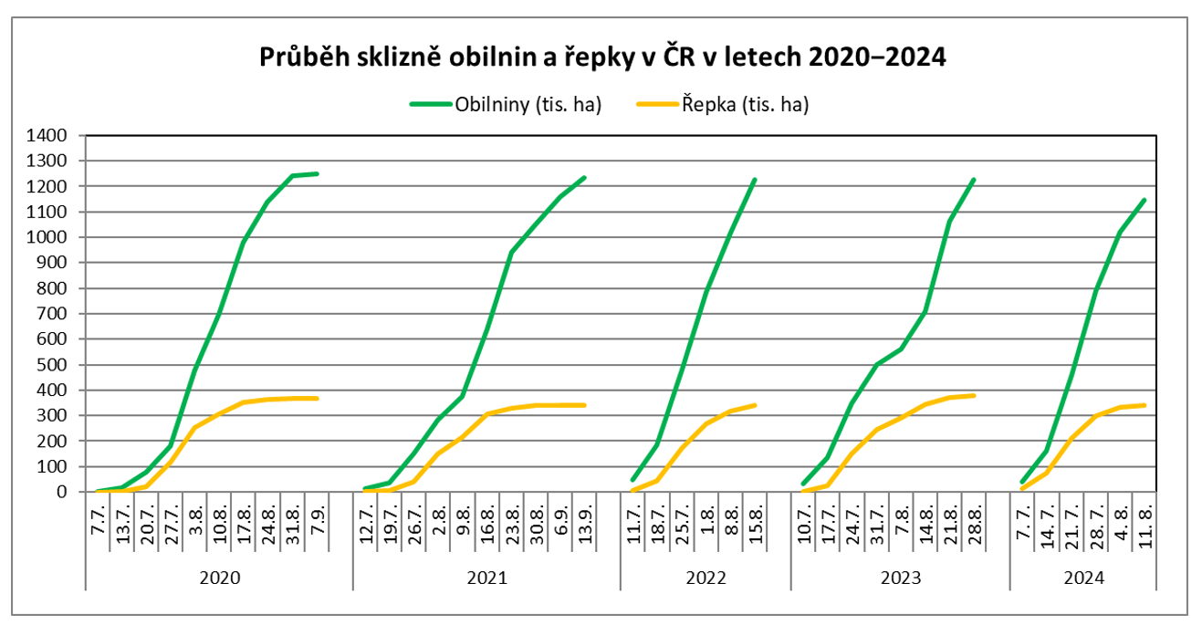 Postup sklizně obilnin a řepky v České republice k 11. srpnu 2024