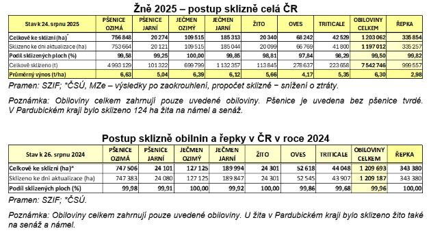 Celková sklizená plocha obilnin již dosahuje 1 197 012 ha (99,50 % ploch), zbývá tak sklidit ještě 6 050 ha. Celková produkce obilovin při průměrném hektarovém výnosu 6,30 t/ha dosahuje téměř 7 542,8 tis. tun. V porovnání s loňským průměrným hektarovým výnosem základních obilovin je letošní úroda na vyšších hodnotách. Letošní sklizeň základních obilovin je tak pro zajištění domácí spotřeby obilovin dostačující, dlouhodobě se spotřeba pohybuje ve výši kolem 5 mil. tun.