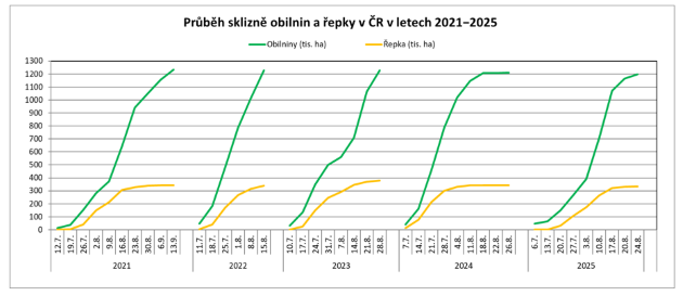 24. 8. 2025 zemědělci sklidili 99,50 % ploch obilnin a 99,82 ploch řepky. Loni byly touto dobou žňové práce téměř již skončeny (viz tabulka Postup sklizně obilnin a řepky v ČR v roce 2024).